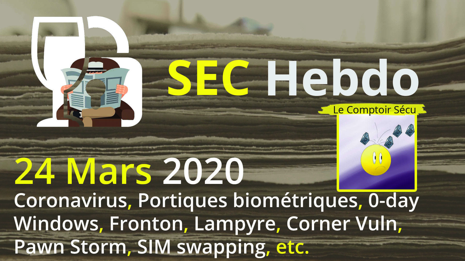 Coronavirus, Portiques biométriques, 0-day Windows, Fronton, Lampyre, Corner Vuln, Pwan Storm, SIM swapping, etc.