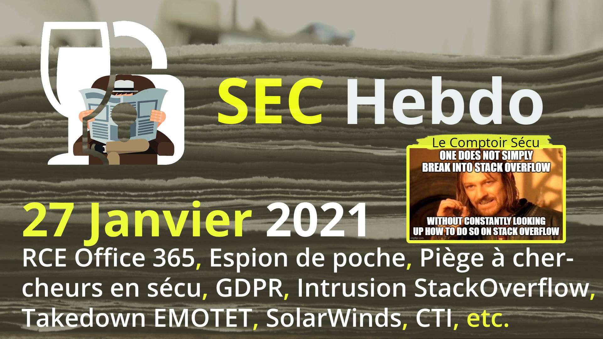 RCE Office 365, Espion de poche, Piège à chercheurs en sécu, GDPR, Intrusion StackOverflow, Takedown EMOTET, SolarWinds, CTI, etc.