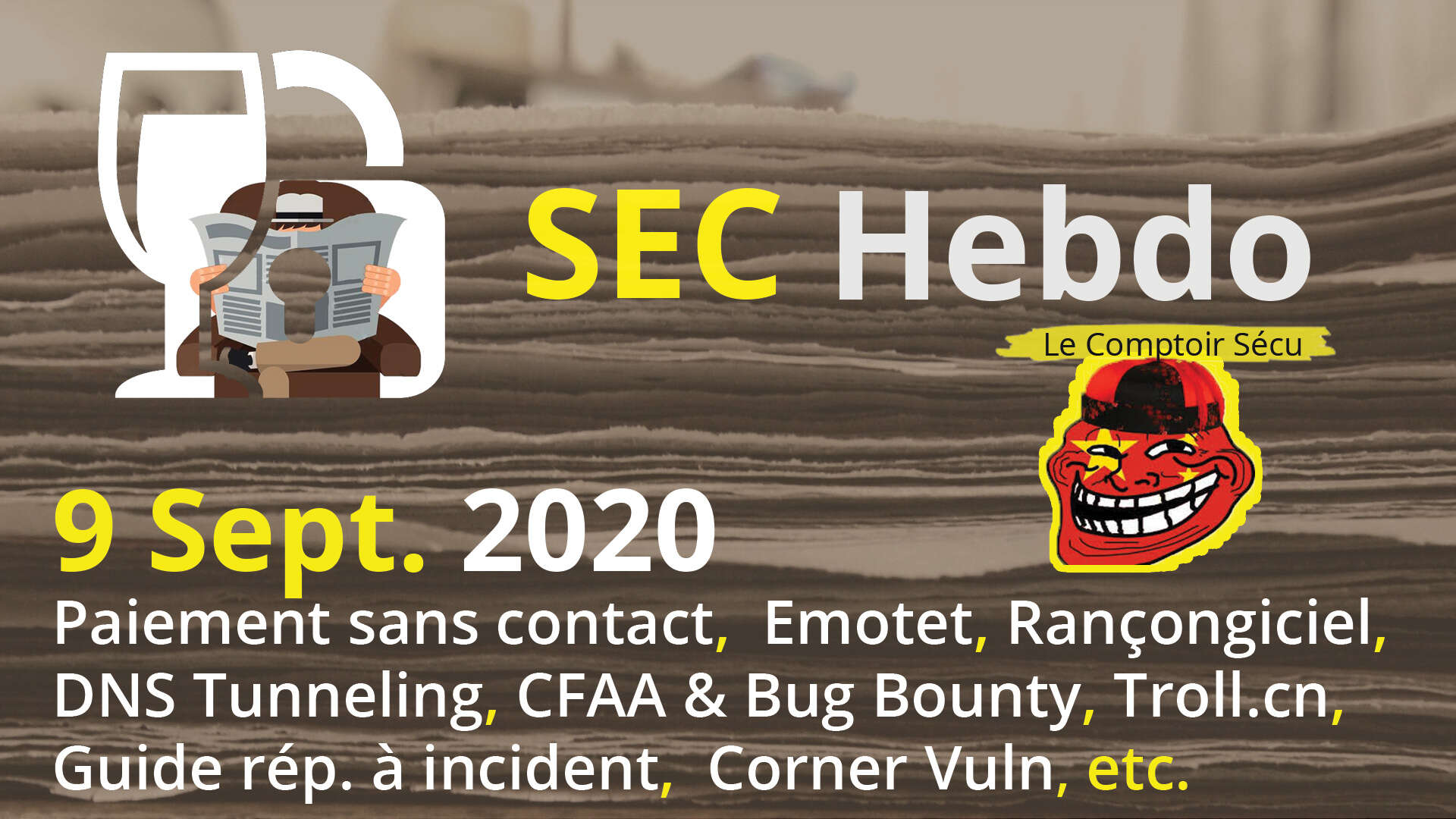 Paiement sans contact, Emotet, Rançongiciel, DNS Tunnelling, CFAA & Bug Bounty, Troll.cn, Guide rép. à incident, Corner Vuln, etc.