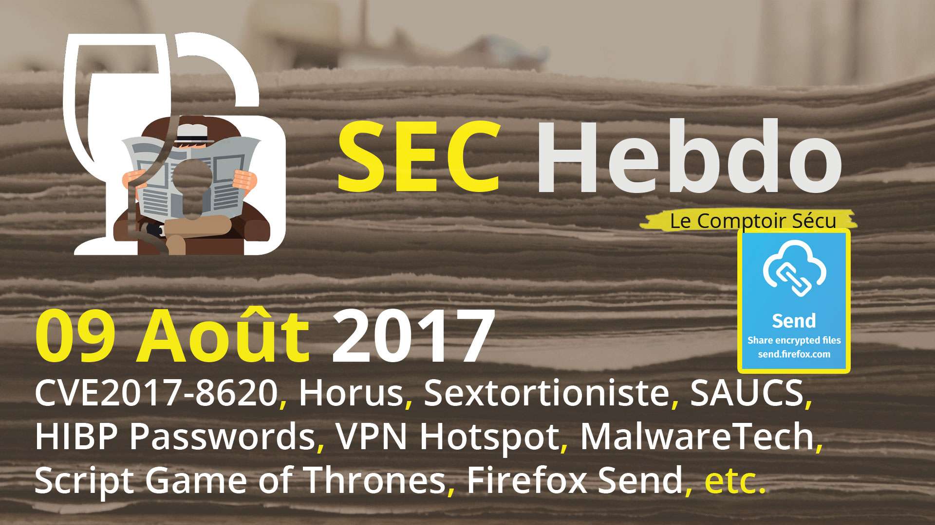 CVE2017-8620, Horus, Sextortioniste, SAUCS, HIBP Passwords, VPN Hotspot, MalwareTech, Script Game of Thrones, Firefox Send, etc.