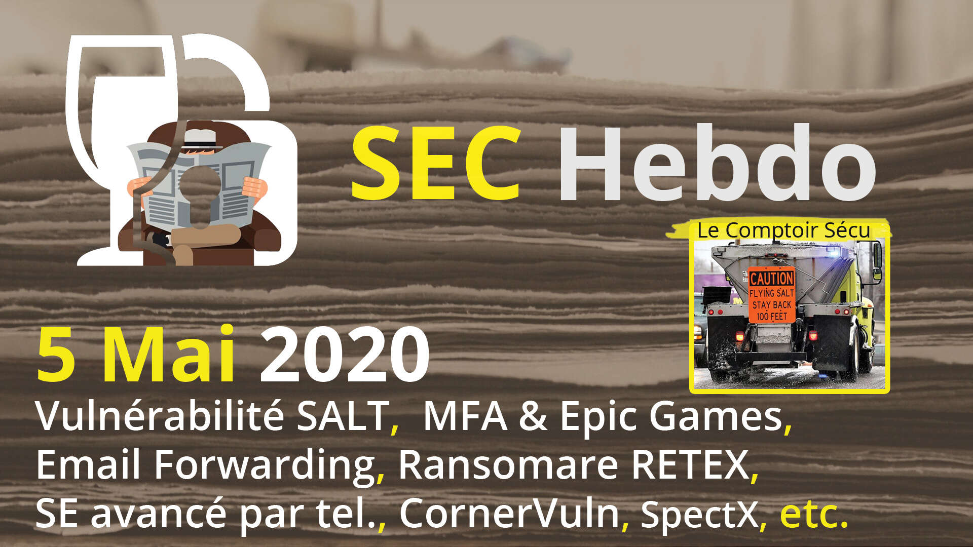 Vulnérabilité SALT, MFA & Epic Games, Email Forwarding, Ransomware RETEX, SE avancé par tél., ConernVuln, SpectX, etc.