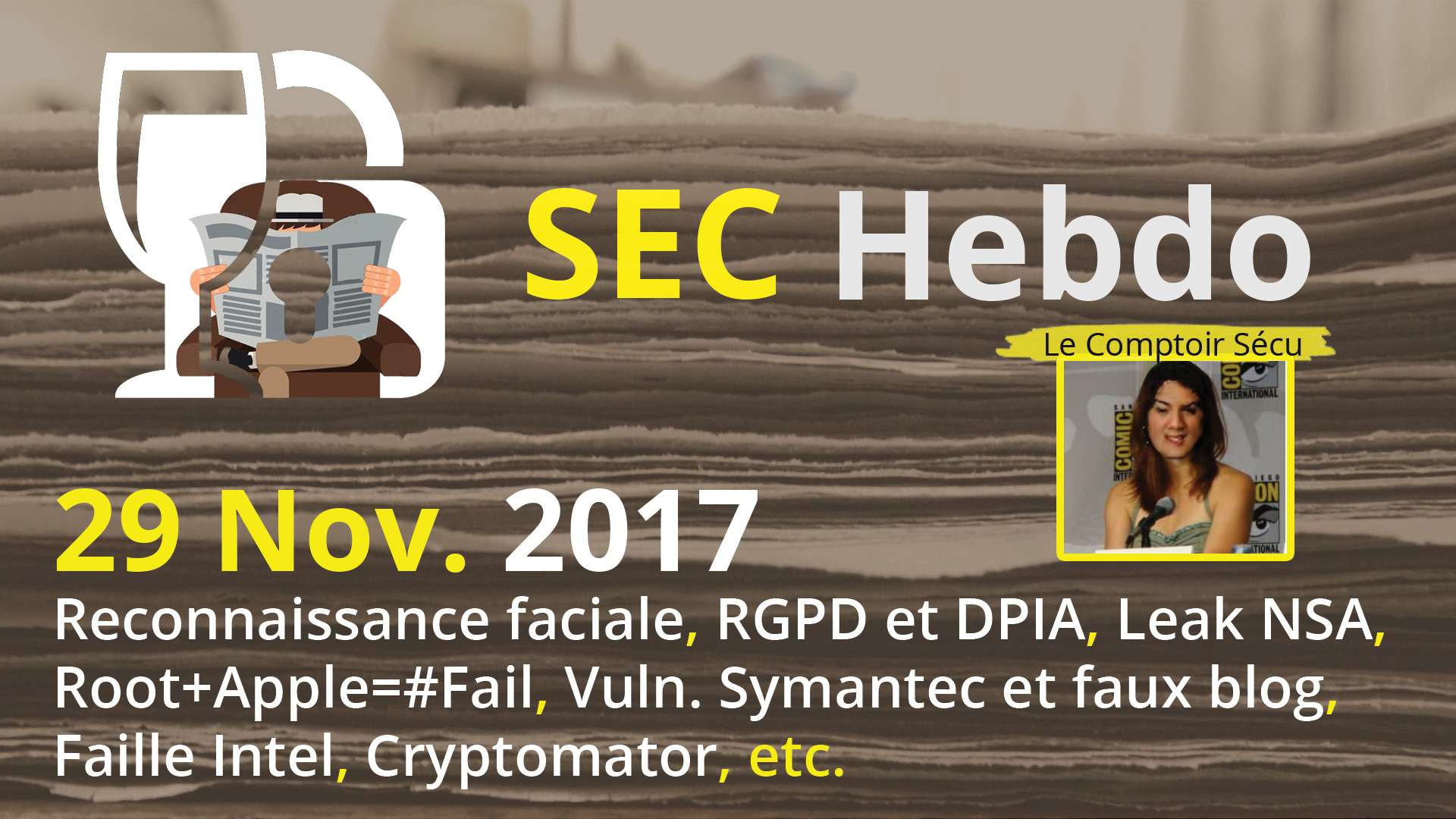 Reconnaissance facile, RGPD et DPIA, Leak NSA, Root+Apple=#Fail, Vuln. Symantec et faux blog, Faille Intel, Cryptomator, etc.