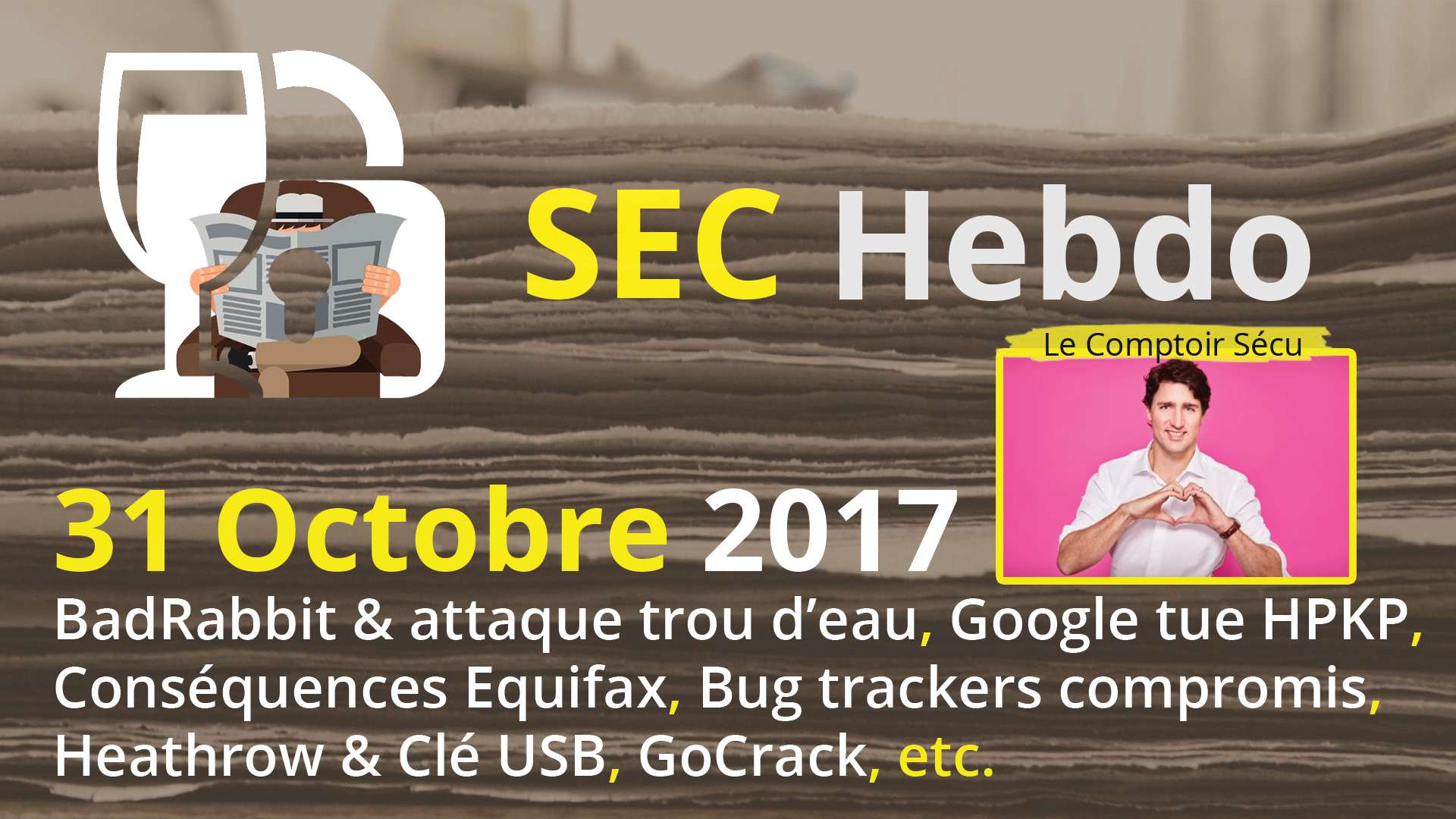 BadRabbit & attaque trou d'eau, Google tue HPKP, Conséquences Equifax, Bug trackers compromis, Heathrow & clé USB, GoCrack, etc.